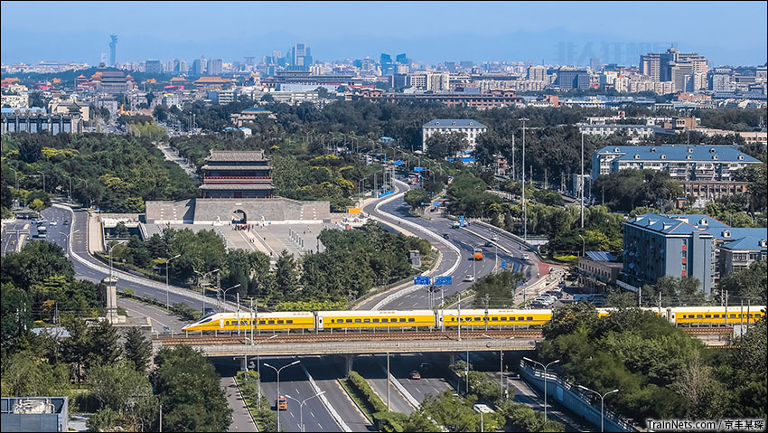 2019年8月23日。CRH5J-0501担当京沪普速线月检车DJ1082次驶过北京中轴线。