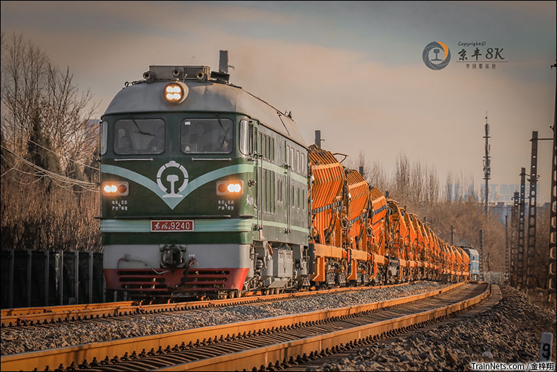 2019年2月。北京环铁联络线。大陈各庄。DF4B-9240、DF4C-4406推挽北京大机运检段渣土清运车进行星火站施工改造渣土清运作业。