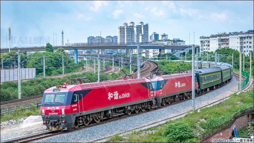 2019年8月。HXD3D双机牵引K21次(北京西-南宁)列车通过衡柳线下行弯道,准备进入柳州站。
