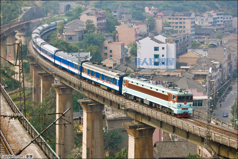 2007年10月。SS3牵引T88次(贵阳-北京西)越过镇远古城。
