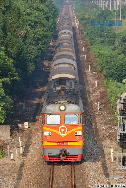 2019年9月25日。清晨DF4K-2609牵引K366次(昆明-广州)接近佛山站。