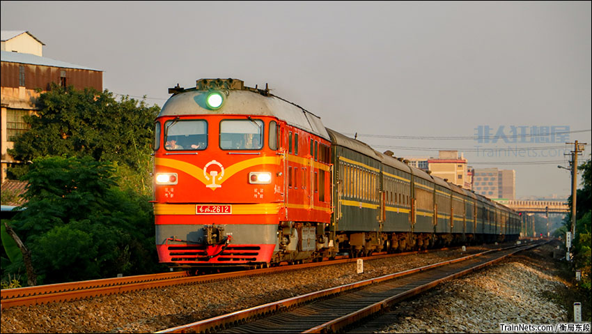 2019年9月25日。一列橘客行驶在日落的晚霞中。