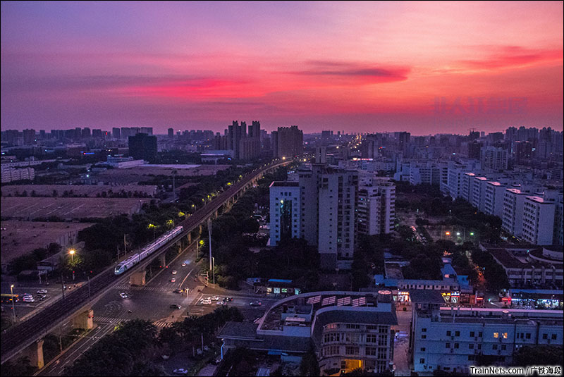 2019年9月13日。海口市郊列车“椰子树号”在晚霞中经过海口市区。(图/吴坤锦)