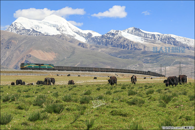 2019年7月25日。NJ2牵引货列在念青唐古拉山下驶过。(图/0奥斑马0)