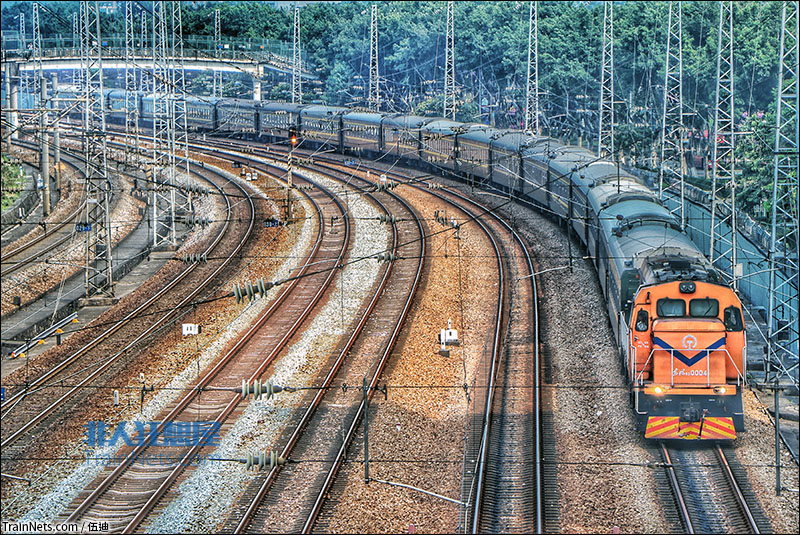 2019年10月。DF5D-0004调机牵引0K4264次车底驶出石牌站,前往广州东站。