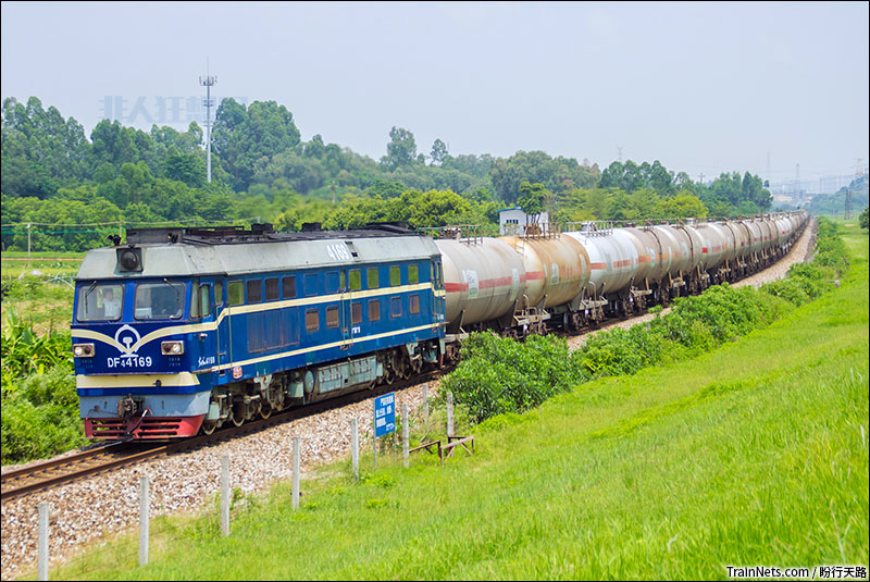 2019年7月16日。广茂明星车DF4C-4169牵引整列油龙通过三水北江大堤。