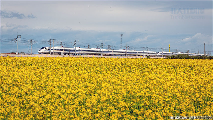 2019年7月。青海。重联CRH2G飞驰在门源花海中,接近门源站。