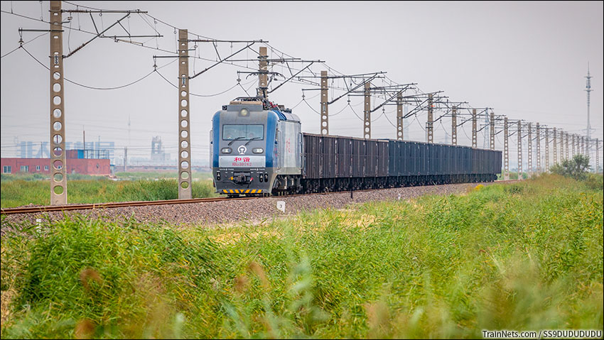 2019年7月。宁夏大武口。HXD3牵引货列驶离平罗站。