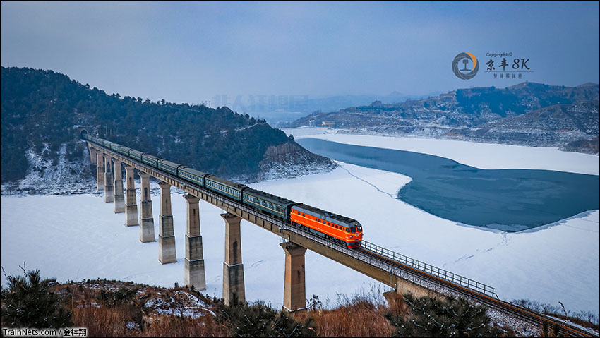 2019年2月。“橘子”牵引2673次(太原-晋城)客车驶过双峰水库大桥,双峰水库冰面上的积雪,是几天前太行山间暴雪的“罪证”。(图/金梓翔)