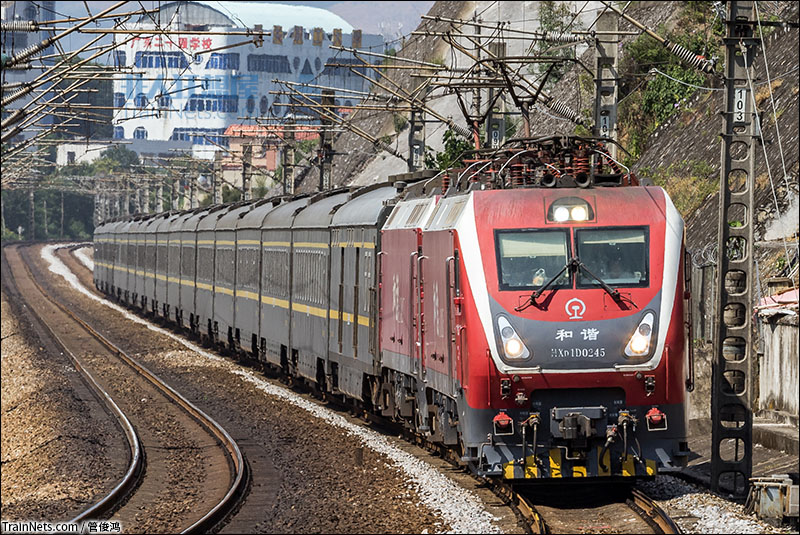 2019年10月。广东韶关。双机HXD1D牵引的客车Z13次(广州东-沈阳北)接近韶关东站。(图/管俊鸿)