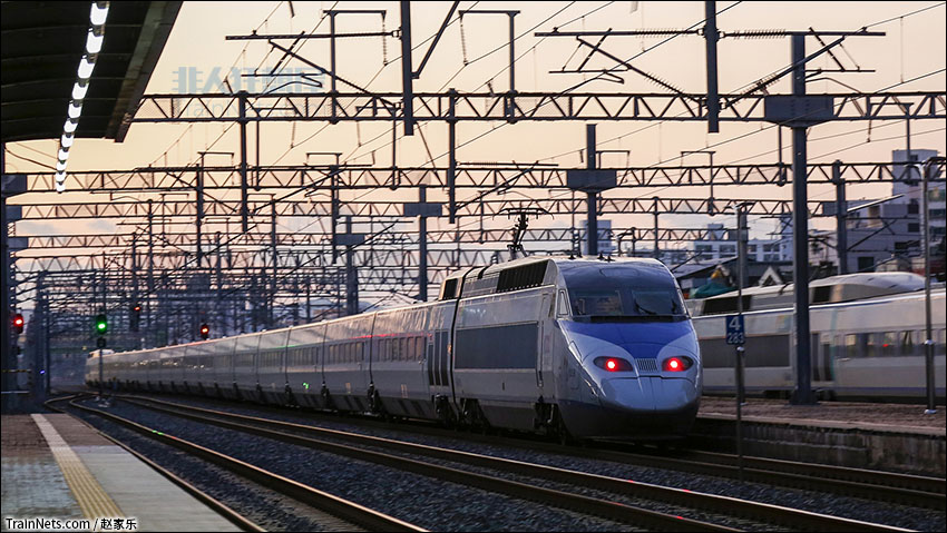 2019年12月。日暮时分。KTX高速列车上行加速通过大邱车站。(图/赵家乐)