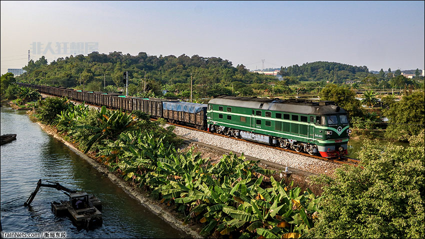 2019年11月11日。下午黄金阳光下,西瓜货列通过正在清理河道的挖掘机旁。(图/衡局东段)