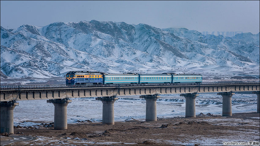 2020年1月17日。内蒙古巴彦淖尔。甘泉铁路通勤车行驶在大佘太站附近的雪山下。(图/罗靖峰)