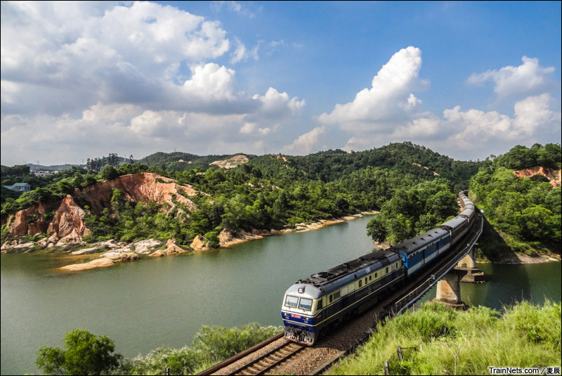 2014年8月15日。广东深圳。DF11牵引K255次通过平南铁路托坑水库。
