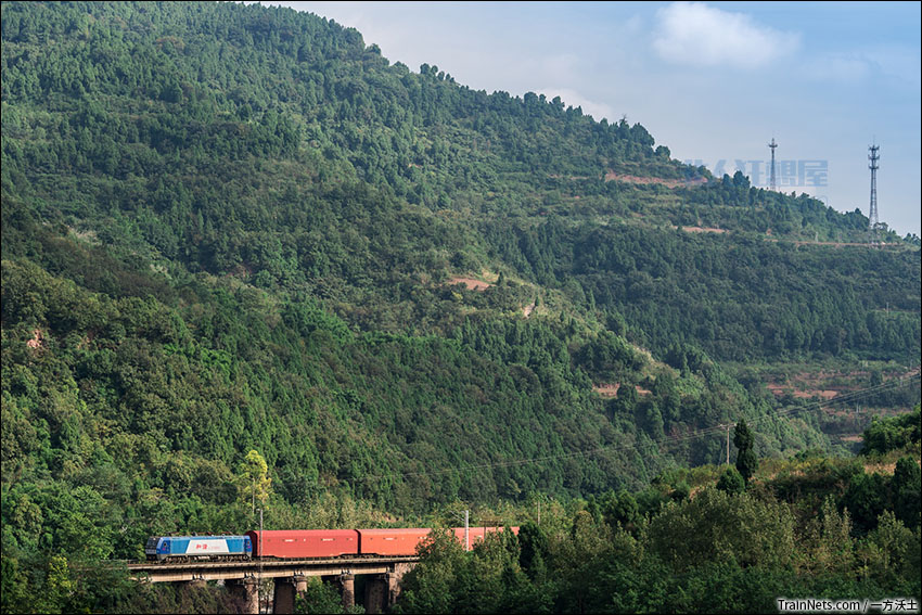 2019年10月4日。成渝线红花塘至陈家湾区间,猛然冲出的下行货列,成渝铁路自成都平原起从洪安乡车站进入龙泉山脉,一路沿龙泉山脉、沱江蜿蜒南下,一路依山傍水,风景优美。(图/一方沃土)
