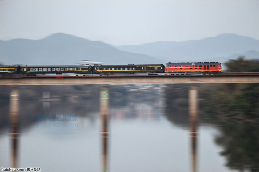 2020年2月1日。梅坎铁路。龙川机务段东风4B-7400牵引25Z型客车担当的T8368次(广州东-大埔)通过漳龙线秋云大桥。(图/梅坎铁路)