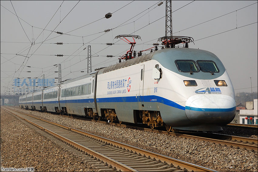 2008年2月29日。成渝城际。蓝箭动车组通过成都站龙潭寺外。(图/安琪)