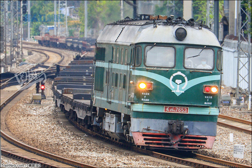 2020年3月11日。广州。DF4-7653牵引板车专列驶入广州西站。