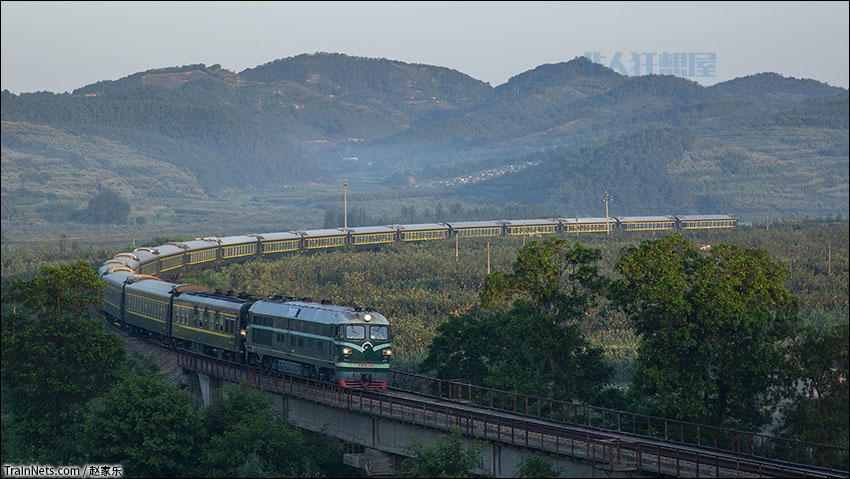 2018年8月,威海地方铁路的大西瓜牵引新空调客车行驶在桃威线。时值收获季,东风大西瓜在大苹果之间穿行。