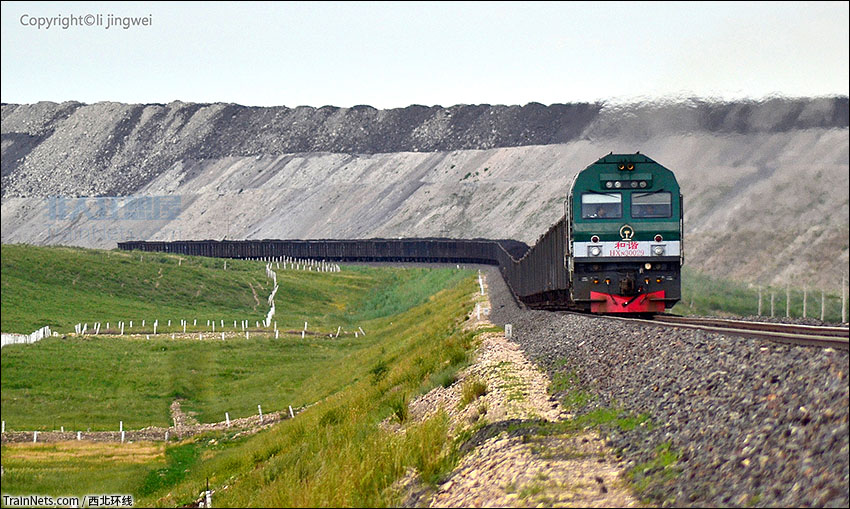 2017年7月。内蒙古西乌旗。沈局霍白线。HXN3牵引114辆编组万吨煤车接近扎哈淖尔车站。