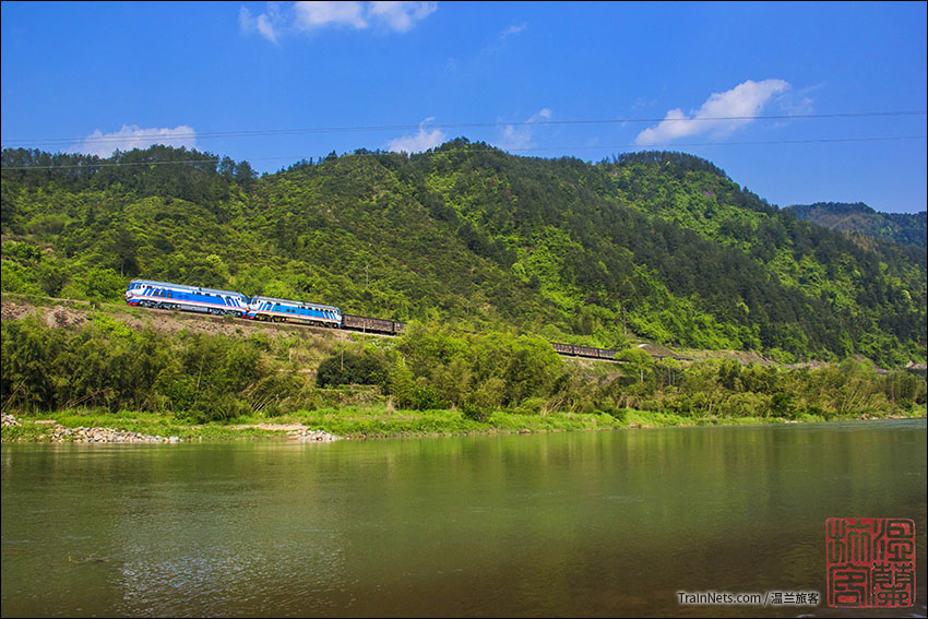 2020年4月。金温线。金温温段DF4D+DF4D牵引货列行驶在好溪河谷中。