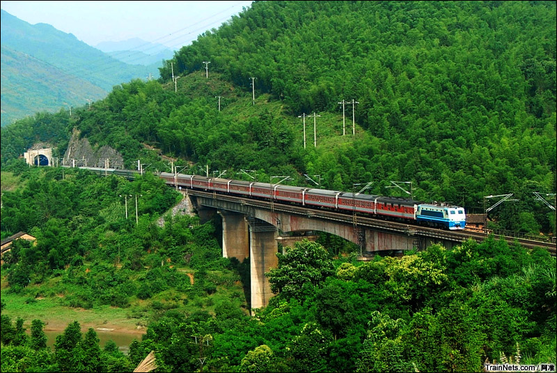 2005年6月11日。京广线。SS8牵引客车经过广东坪石白面石武水大桥,桥下方是旧京广铁路。