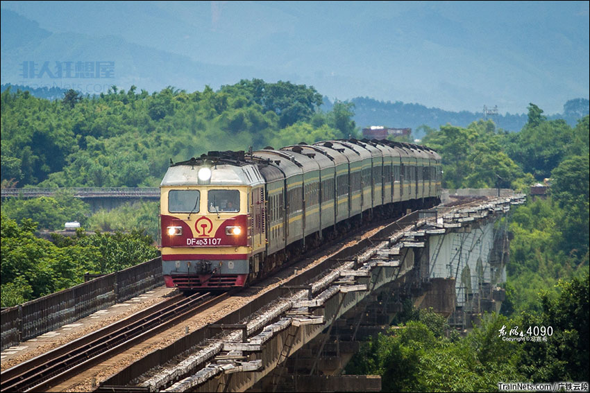 2020年5月。广西梧州。DF4DK-3107牵引T81次(上海南-南宁)接近梧州站。