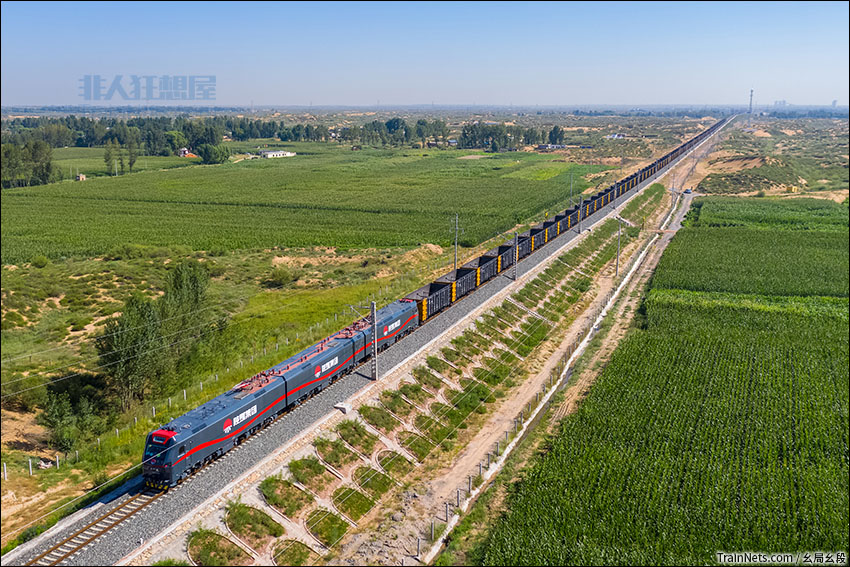 2020年8月9日。陕西榆林。由HXD1-7235“陕煤号”十二轴电力机车担当的电72401次C80大列运行在靖神铁路上。