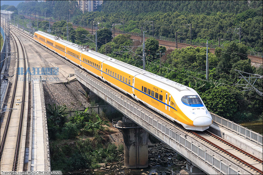 2020年8月29日,CRH2J-0205“黄医生”运行在广清城际下行线,对广清城际铁路设备设施开展综合检测。