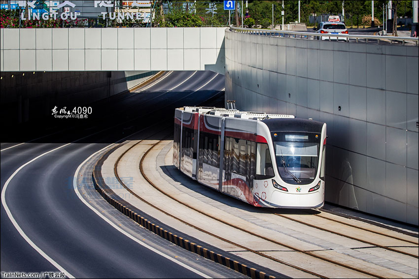 2020年7月,广州黄埔有轨电车,一列有轨电车驶进岭头隧道。