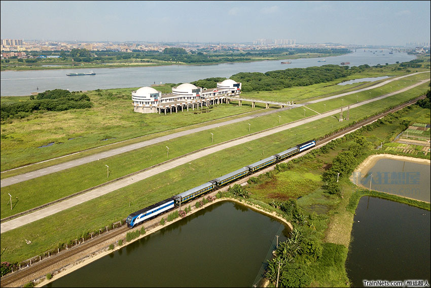 2020年5月4日。上午8时38分。K9049次广铁拆猪动车组下行通过广东省佛山市南海区狮山镇北江大堤段。