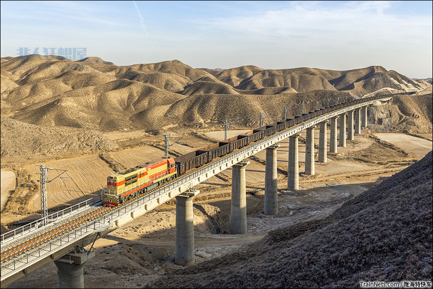 2021年1月21日。甘肃兰州。朱中铁路。DF7G牵引大列空车行驶在大桥上。