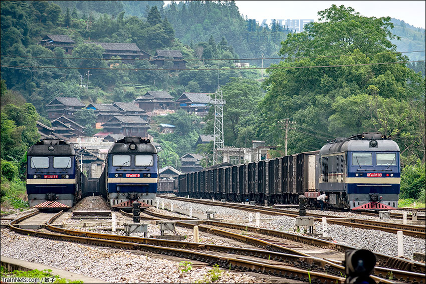 2019年6月30日上午,焦柳线八斗站。停靠在八斗站三列DF8B货列。火车与不远处的侗寨遥相呼应。