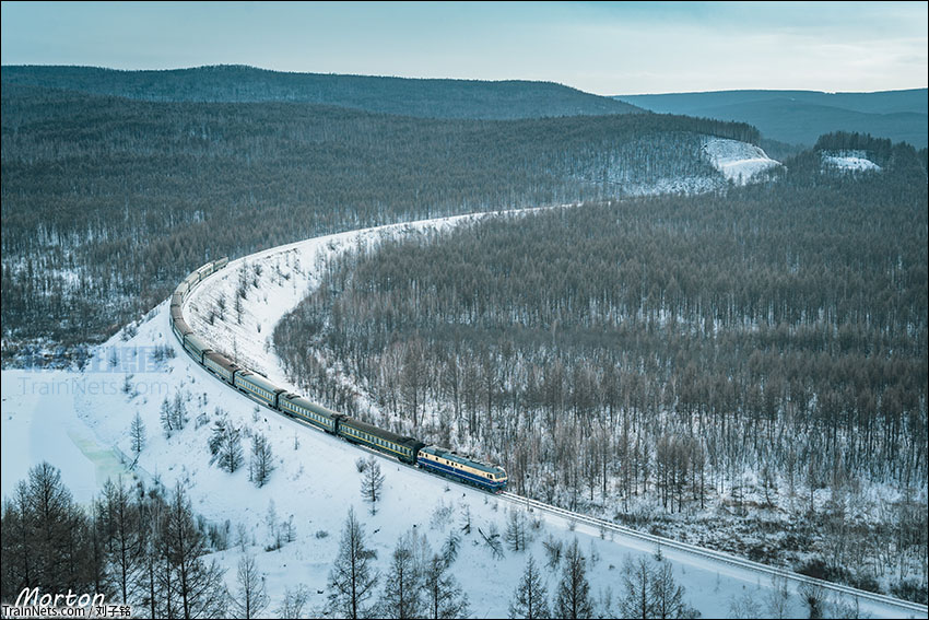 2020年1月24日。K7095次(海拉尔-哈尔滨)驶出岭北站,冬日的林区透露着纯净的色彩。