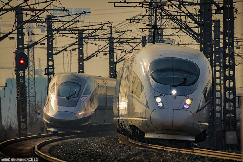 2021年1月11日,胶济客专K298+600m,夕阳下,CR400AF与同样配属济南局的CRH380B会车,承担着胶济客专沿线城市居民走出山东的跨局车次的重要责任。