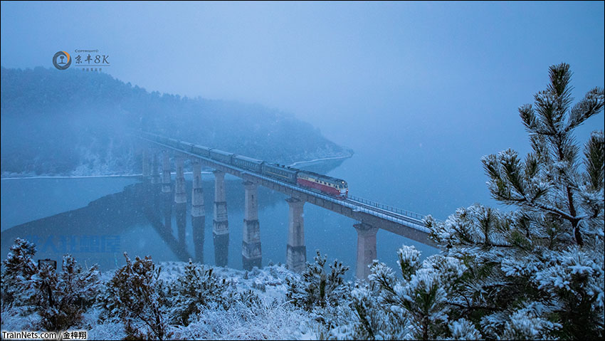 2021年3月。太焦线。客车K904次(厦门北-太原)伴着风雪驶过双峰水库大桥。