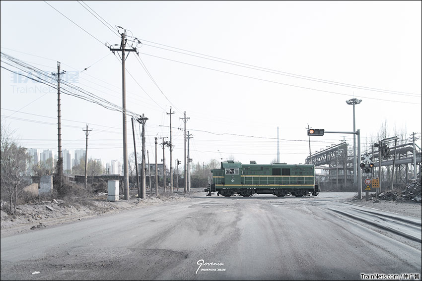 2021年4月8日,鞍钢铁路,东方红7型调车机车缓缓开过平交道口。
