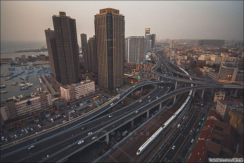 2021年4月16日。夕阳下,G189次(北京南-青岛)下穿新冠高架即将到达终点站。