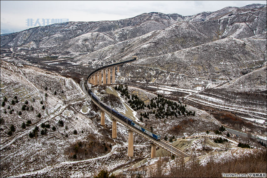 2020年11月22日,宝中线上行货列行驶在初雪后六盘山附近,接近三关口站。
