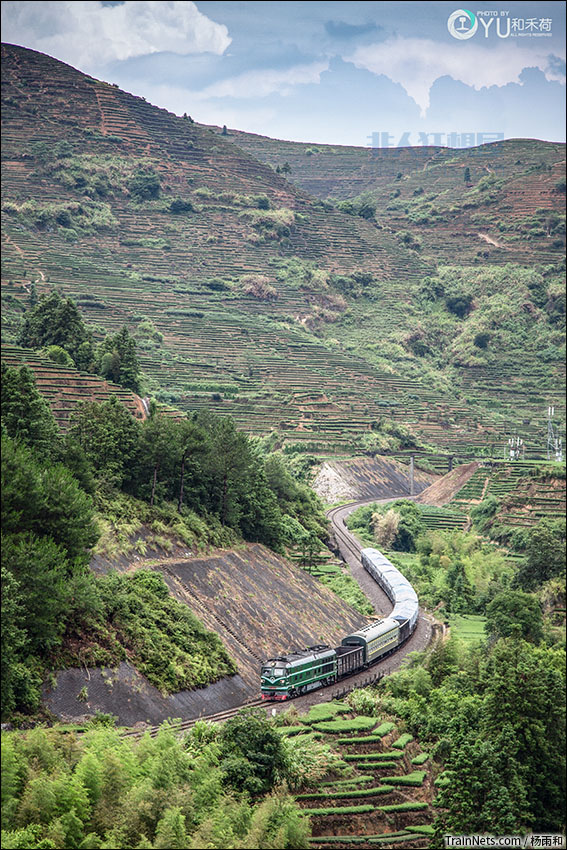 2020年7月,漳泉铁路,每日开行的通勤车在茶山中穿行。
