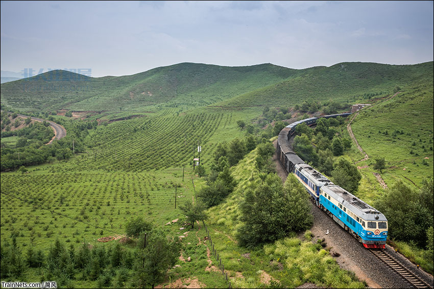 2021年7月26日。DF4DH与DF8B牵引货物列车行驶在热水展线上。
