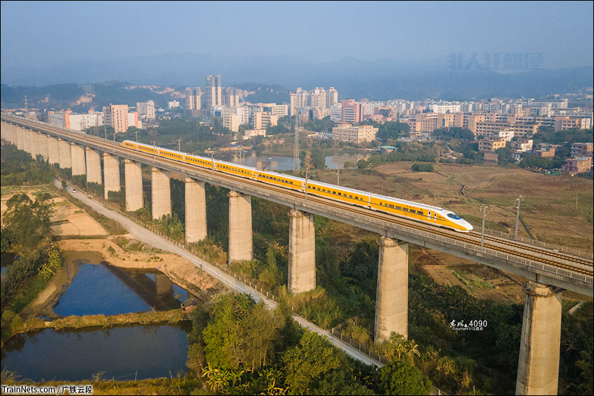 2021年2月。广东云浮。南广线。CRH2J-0205执行检测任务接近云浮东站。
