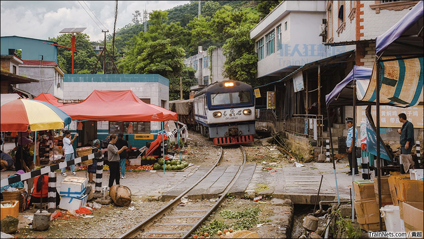 2020年7月6日。云南白鹤桥。姗姗来迟的火车通过即将散去每周且一次的集市。