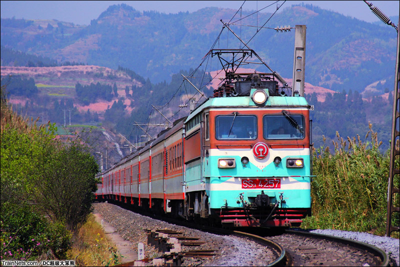 2015年3月21日。成渝铁路五凤溪站。SS3牵引客车通过。