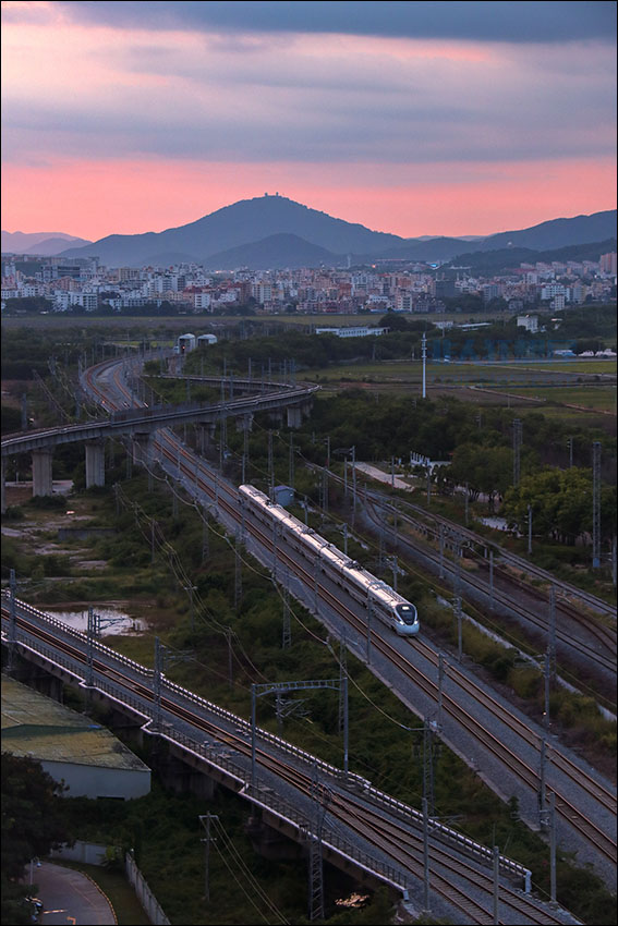 2021年10月2日。夕阳下1AA经西线即将到达三亚站,上方是动车所出入库线,右边是三亚折返所。