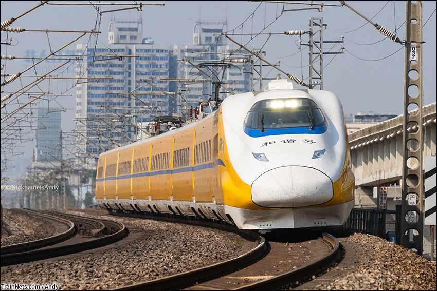 2021年2月23日。下午2点40分,完成广清城际综合检测任务的CRH2J黄医生经既有线下行通过广州北站,鸣笛通过雅瑶大桥。