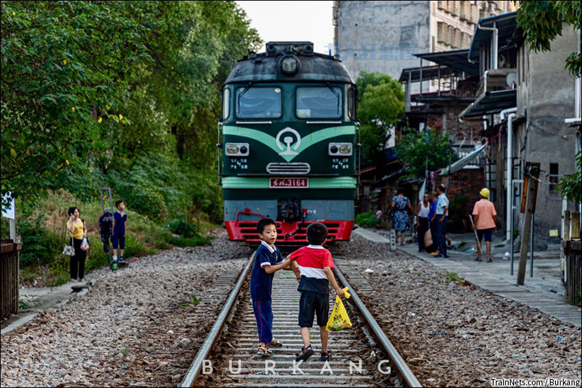 2021年9月。永州永西联络线。两个小孩跑到了铁轨中心,前面是一台比较少见的“开口瓜”。市民走在铁路的场景在当地很常见。