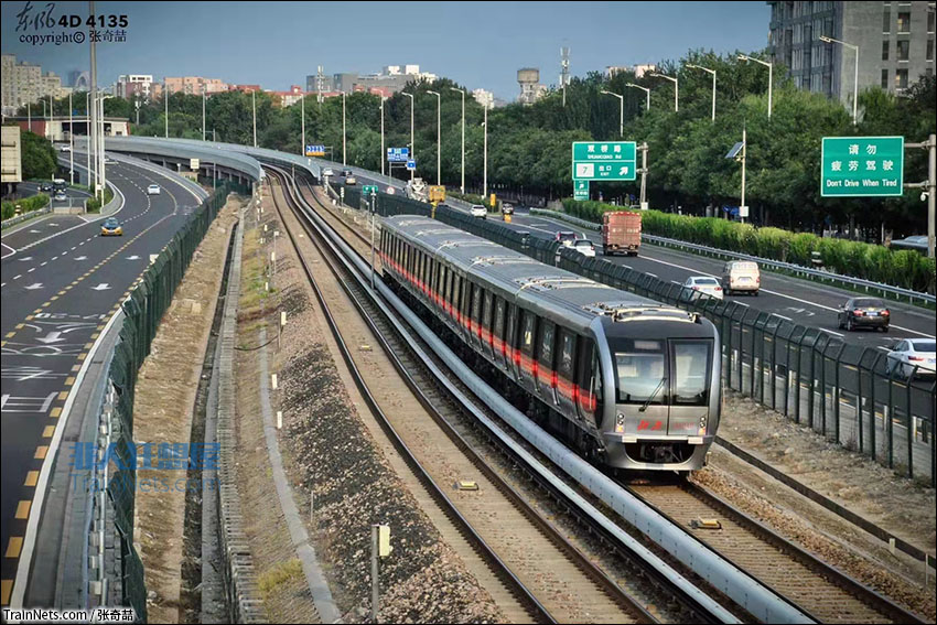 2021年8月29日,北京地铁八通线与一号线贯通首日,SFM04型车行驶在管庄-双桥区间。