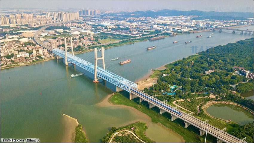 2021年9月28日。下午4点多,一列CR300AF“复兴号”动车组列车上行通过佛山市南海区贵广南广铁路北江大桥,今日南海区丹灶镇。