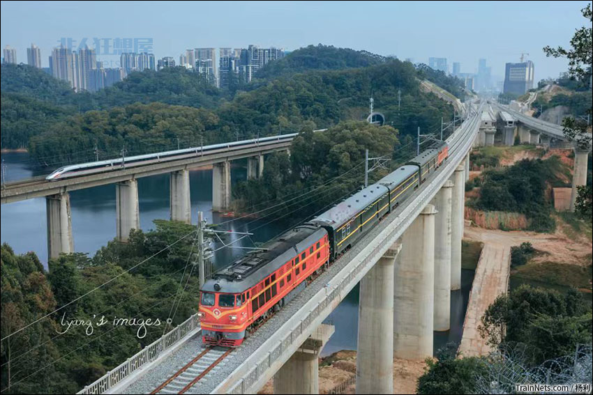 2021年11月。赣深高铁莞塘联络线进行最后的调试,广铁集团派出“双橘”医生进行整治,列车通过深圳高峰水库路段,与远处的广深港高铁并行。